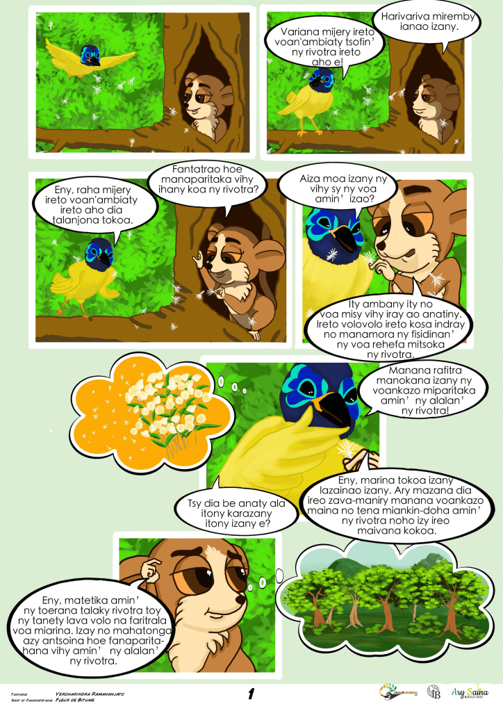 With a science-communication grant from the Department of Integrative Biology at the University of California Berkeley, I partnered with Fleur de Bitume Art, a Malagasy artist to design Comic Strips on the main topics of Seed Dispersal Ecology in Madagascar. Initially, we presented and shared the Comic Stips in Malagasy to several primary and secondary schools in Antananarivo and community-led associations in Ranomafana, and Andasibe-Ihofa in partnership with the members of Association Ary Saina. More recently, we translated them in English and exhibited them during the After Dark series at the Exploratorium Museum in San Francisco with the Razafindratsima Lab.